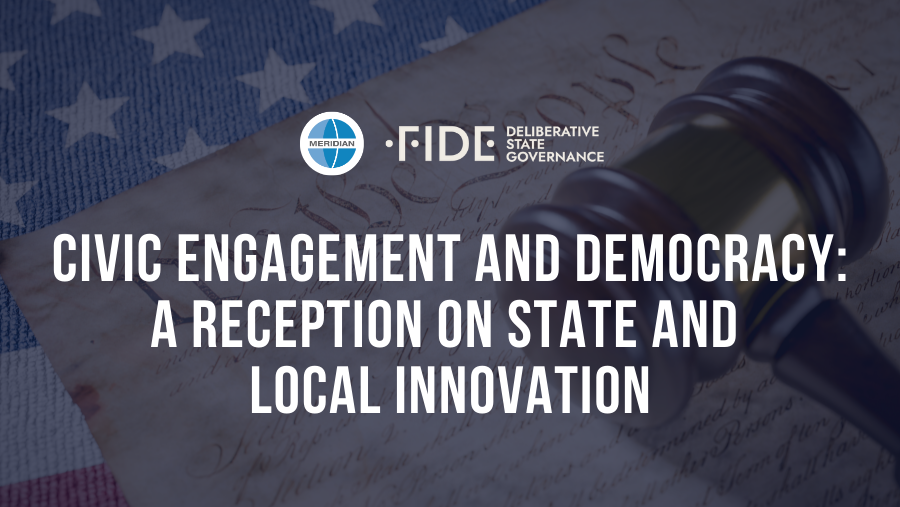 Strengthening civic engagement and democratic governance depends on practical, locally driven solutions. Meridian International Center, in partnership with the Federation for Innovation in Democracy (FIDE)–North America, will host Civic Engagement and Democracy: A Reception on State and Local Solutions, a discussion focused on state and local approaches in the United States and abroad to strengthen civic engagement, improve government effectiveness, and support bipartisan dialogue.