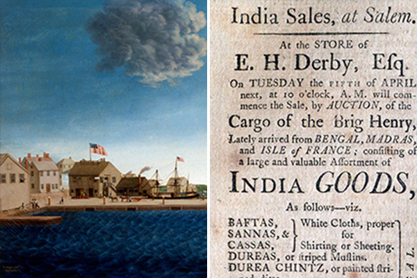 In India, Americans preferred to avoid British middlemen and instead dealt with Indian commercial agents. The relationships they established with these merchants provided valuable opportunities to learn first-hand about the places and people they encountered. In Bombay, for example, Nusserwanjee Maneckjee Wadia, a specialist in the American market, handled the business of George Nichols from Salem. The two men became friends, exchanging gifts of Kashmiri shawls and books on navigation. Wadia supplied a fine striped-muslin fabric for the wedding gown of Nichols’ bride-to-be.