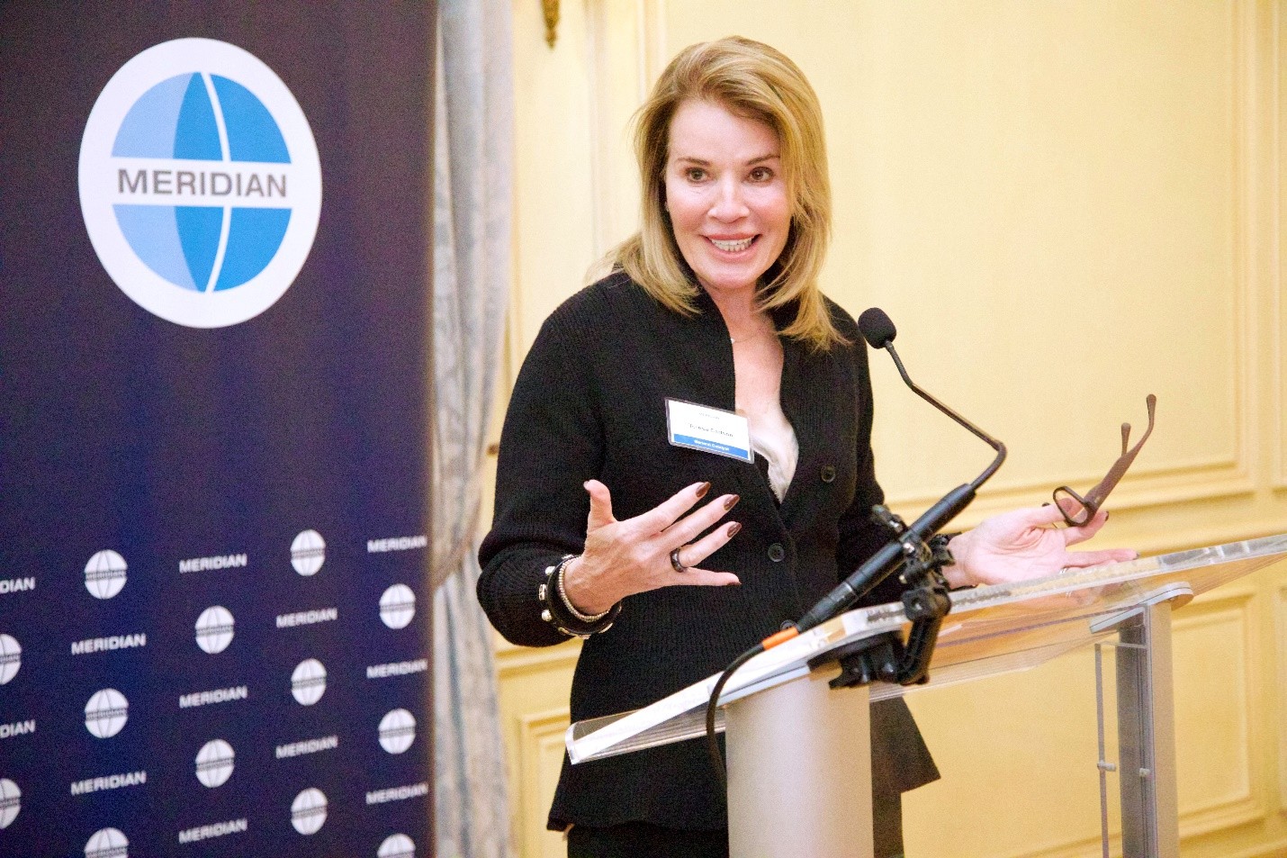 Meridian board member Ms. Teresa Carlson (General Catalyst) raises a toast to celebrate the launching of the Tech Labs at Meridian International Center at the Tech Labs Reception on October 14, 2025, at Meridian Internation Center in Washington, DC. Photo by Erik Cieslewicz.