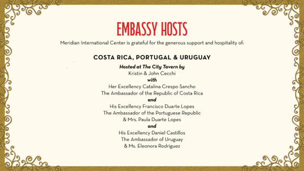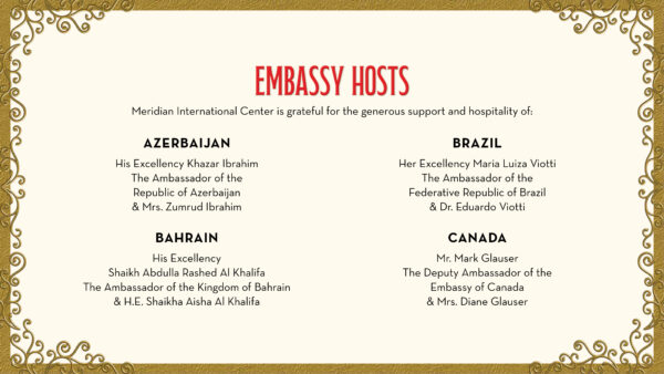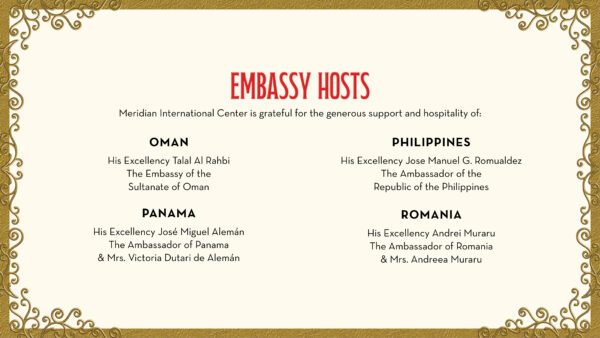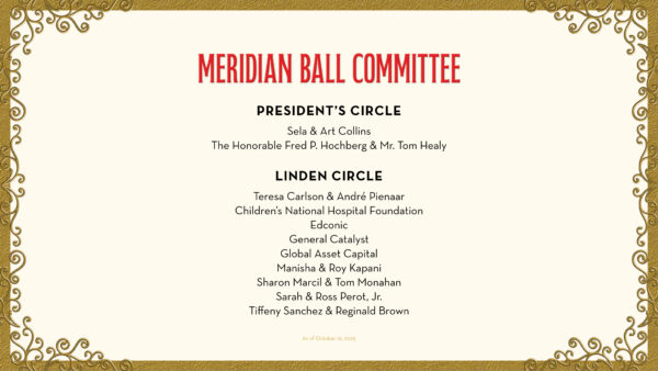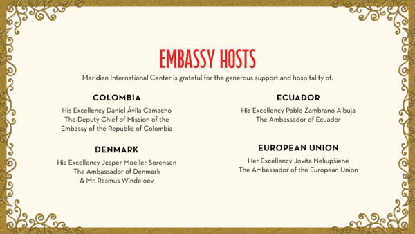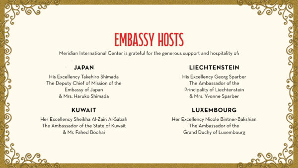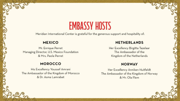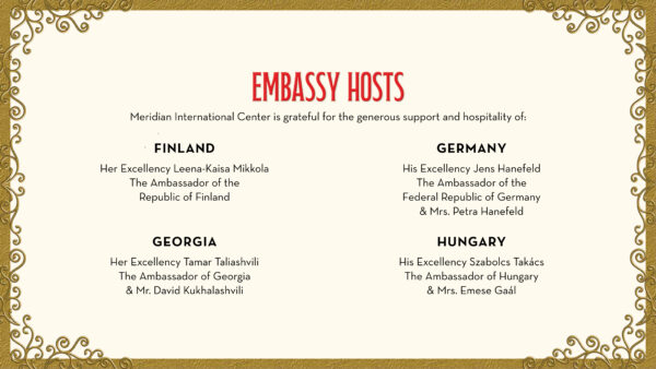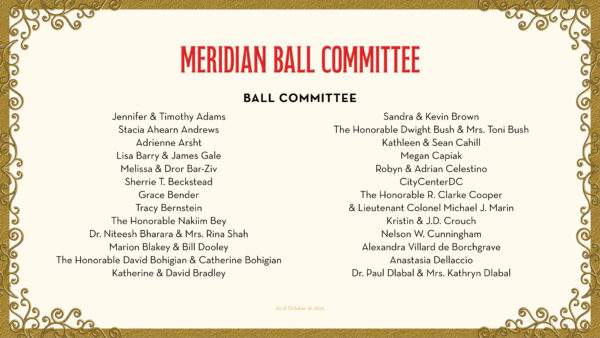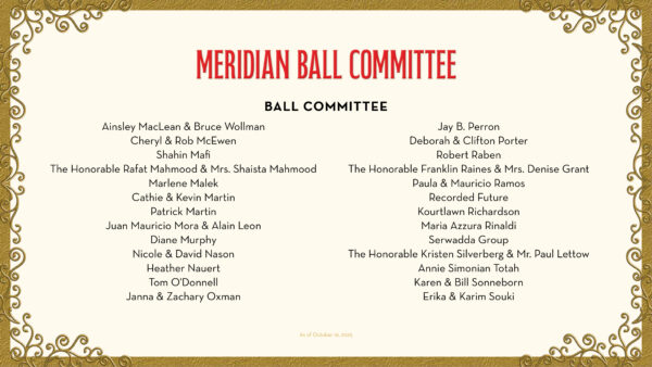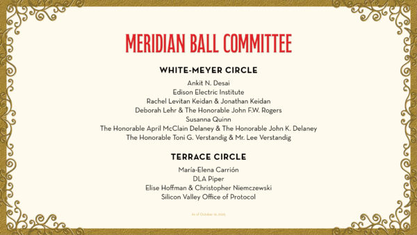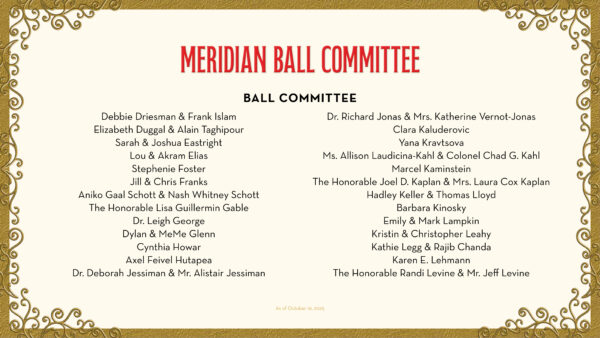 The 57th Annual Meridian Ball brought together administration officials, members of Congress, media figures, foreign ambassadors, and international business and cultural leaders on October 24, 2025, to celebrate the enduring power of diplomacy and collaboration. This signature evening honored Meridian’s mission and, thanks to the leadership of our chairs and the generosity of our guests, supported our efforts to prepare global leaders to navigate a rapidly evolving world. The funds raised will strengthen Meridian’s exchange, training, and cultural programs that foster understanding and cooperation across borders.
