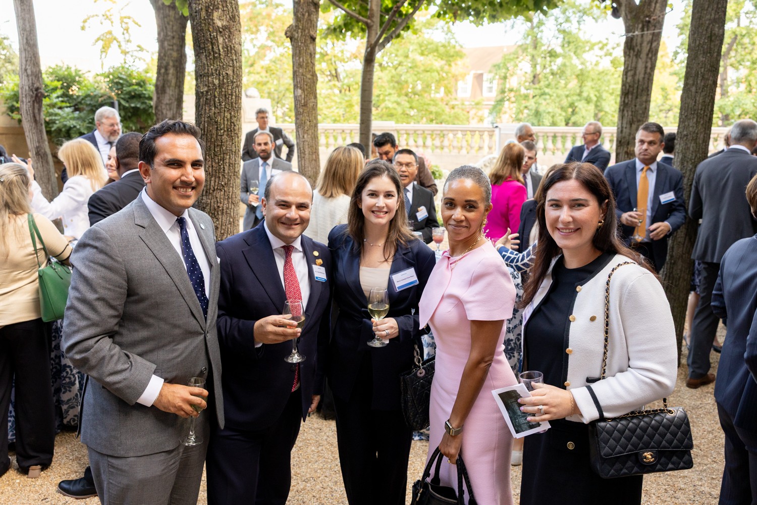 From left to right, Puru Trivedi, Meridian International Center; H.E. Narek Mkrtchyan, Ambassador of Armenia; Maria Chaves, Embassy of Uruguay; Tiffany Atwell, EcoLab; and Lea McCabe, Ecolab, posing for a photo in the Linden Grove during Welcome to Washington on September 9, 2025. Photo by Jess Latos.