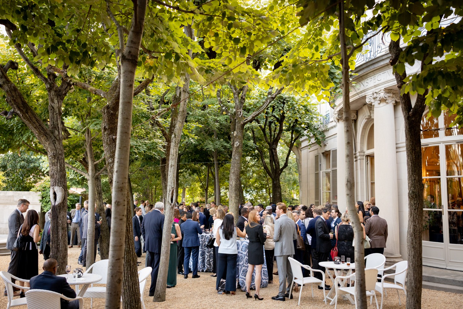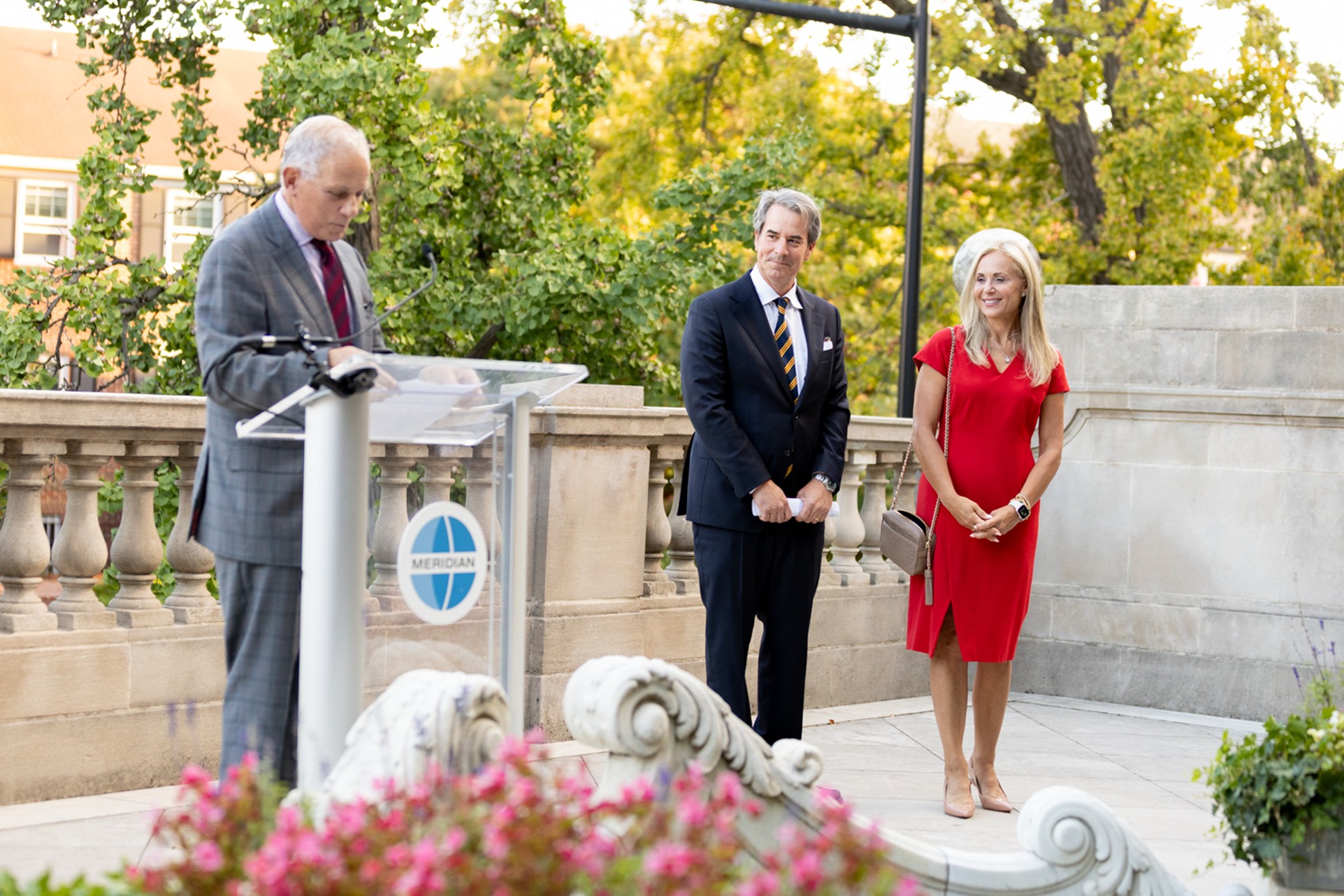 T.H. Stuart Holliday, Meridian International Center, and Deborah Lehr, Meridian International Center, listening to T.H. Fred Hochberg provide remarks in the Linden Grove during Welcome to Washington on September 9, 2025. Photo by Jess Latos.