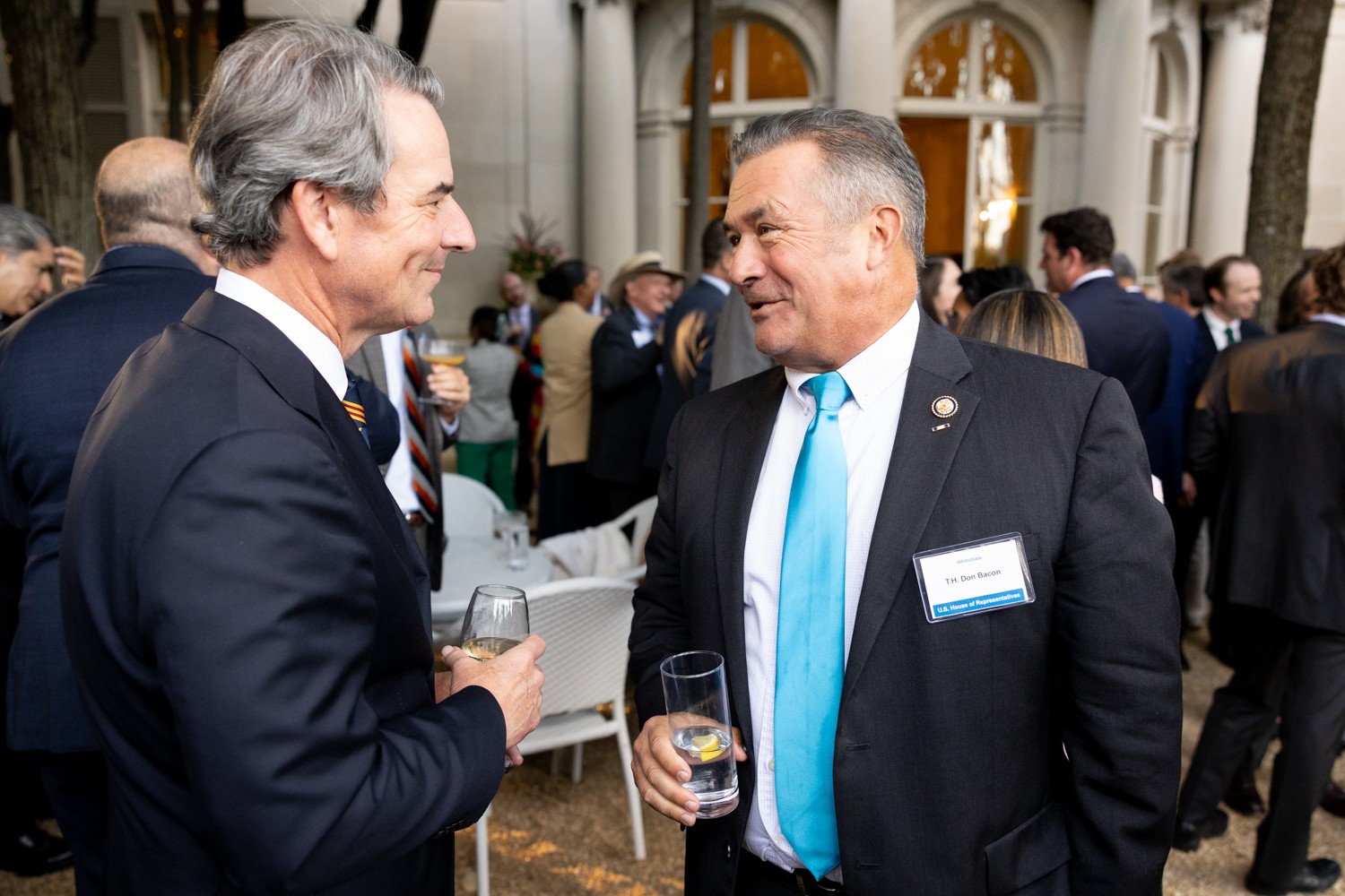 T.H. Stuart Holliday, Meridian International Center (Left) in conversation with Congressman Don Bacon (Right) in the Linden Grove during Welcome to Washington on September 9, 2025. Photo by Jess Latos.