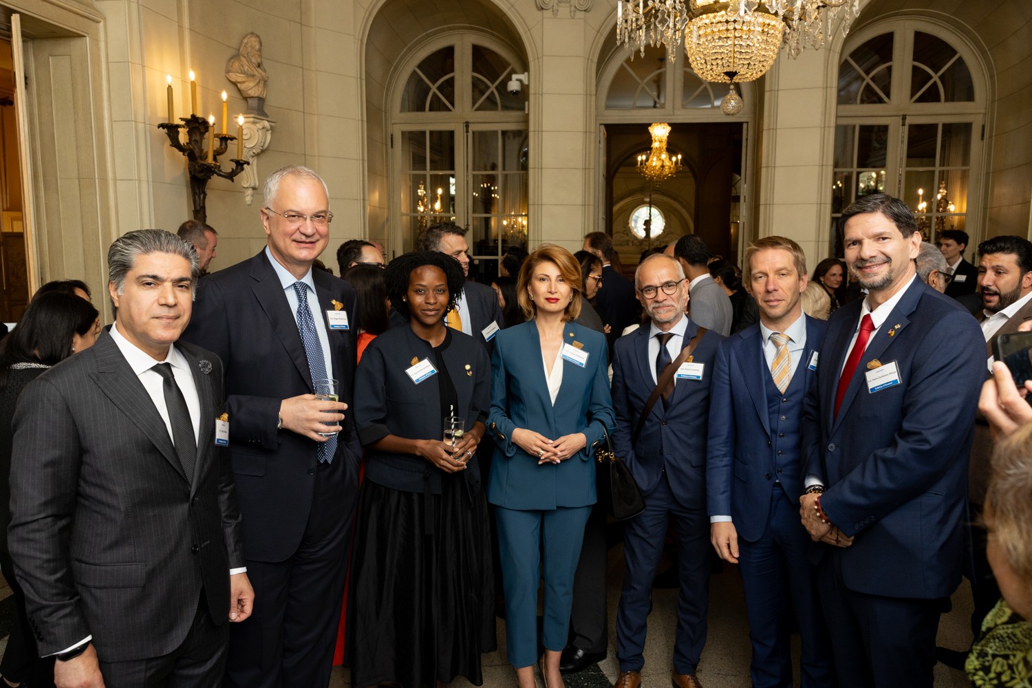 Ambassadors of Honor posing together for a photo (from left to right), H.E. Talal Alrahbi, Ambassador of Oman; H.E. Dragan Šutanovac, Ambassador of Serbia; H.E. Agniola Ahouanmenou, Ambassador of Benin; H.E. Tamar Taliashvili, Ambassador of Georgia; H.E. Daniel Castillos, Ambassador of Uruguay; H.E.H Frédéric Bernard, Ambassador of Belgium; H.E. Pablo Zambrano Albuja, Ambassador of Ecuador, in Meridian House during Welcome to Washington on September 9, 2025. Photo by Jess Latos.
