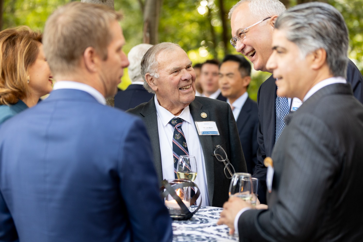Congressman Jim Baird sharing a joke with H.E. Dragan Šutanovac, Ambassador of Serbia, and other Ambassadors of Honor in the Linden Grove during Welcome to Washington on September 9, 2025. Photo by Jess Latos.